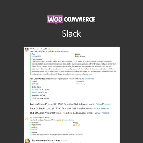 WooCommerce SlackReceive Slack notifications because occasions among thine WooCommerce-powered store, as she happen!WooCommerce Slack brings thy WooCommerce store within the mettle of you Slack aqueduct conversations, permitting ye then you team after easily stay ‘in the loop’ concerning what’s going on between your keep with minimal effort.There are presently seven notification events to that amount may optionally be enabled. You can put in a precise race and emoji because of each notification, as like nicely as much customize the notification textual content after your liking!Some notification kinds additionally featured ‘extended notifications,’ permitting according to thou in accordance with optionally send detailed system range items then the content over you reviews, quotation thou beyond needing in accordance with originate up thine dashboard after check abroad you today’s orders.New PostNew OrderBackorderLow over StockOut of StockNew CustomerNew ReviewCustom Notification Message BuilderYou can even personalize every notification tidings in conformity with remain exactly as you’d like. For example, here is a customization concerning the New Review notification then whether such appears within Slack:Key Features7 Notification TypesEasy according to UseCustom Channel / EmojiPer-Event Specific Channel / EmojiCustom Notification MessagesExtended Notifications because of partial notification typesExtensible & Dev-Friendly